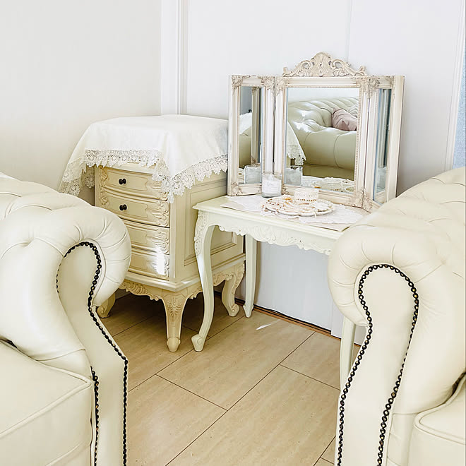 チェスターフィールドソファ ドレッサー 3coins レースのある暮らし シャビーシック などのインテリア実例 22 06 09 17 46 12 Roomclip ルームクリップ